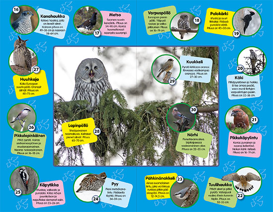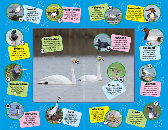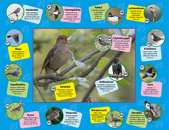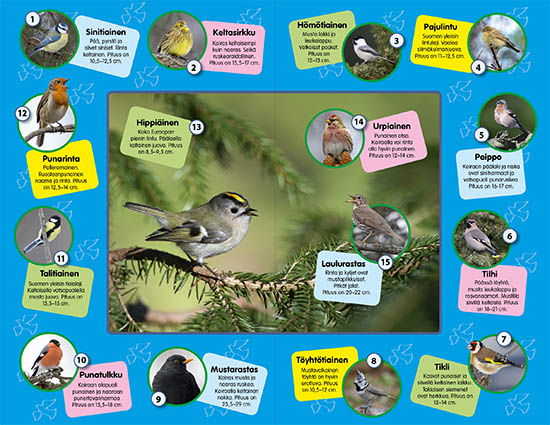Suomen linnut - Suuri lintuäänikirjaKoe lintujen äänimaailma, tee linturetki kotonasi! Tässä kirjassa pääset tutustumaan yleisimpiin lajeihin. Tahdotko oppia tunnistamaan lintujen ääniä? Avaa kirja, paina ääninappia ja kuuntele haluamasi linnun laulua. Mukana 60 kiehtovaa lintua!